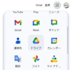 Googleトップページ右上の点々を押すと、メニューの中に「ドライブ」があります。