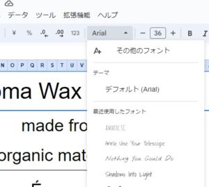 どこか文字が入っているセルを選択して、上のツールバーの「Arial」と書かれているところをクリック。