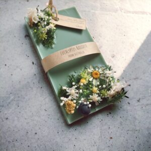 ベースにヒムロスギを敷いて、ノースポール、スターフラワー、スターチス、アキレア、ストーベ、シャリンバイの実などなど、たくさんの種類の素材で飾り付けをしました。